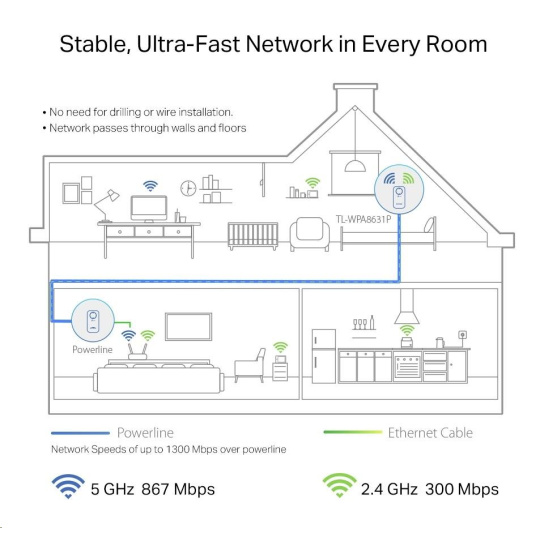 - Dvoupásmová síť Wi-Fi AC1200 – zařízení rozšíří ultra rychlou dvoupásmovou Wi-Fi síť s rychlostí až 867 Mbit/s v pásmu 5 GHz a až 300 Mbit/s v pásmu 2,4 GHz.