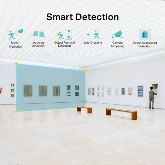 - Inteligentní detekce: Přijímejte oznámení a kontrolujte kanály, když někdo překročí hranici, vstoupí do nastavené oblasti, překáží kameře nebo odstraní/opustí objekty.