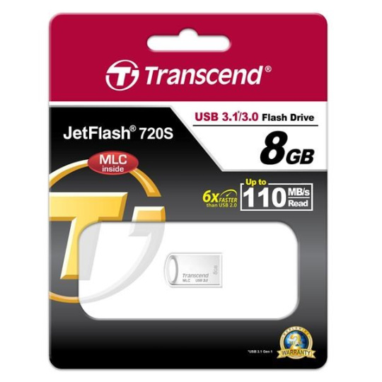 TRANSCEND Flash Disk 8GB JetFlash®720S, USB 3.1, MLC solution (R:110/W:25 MB/s) stříbná