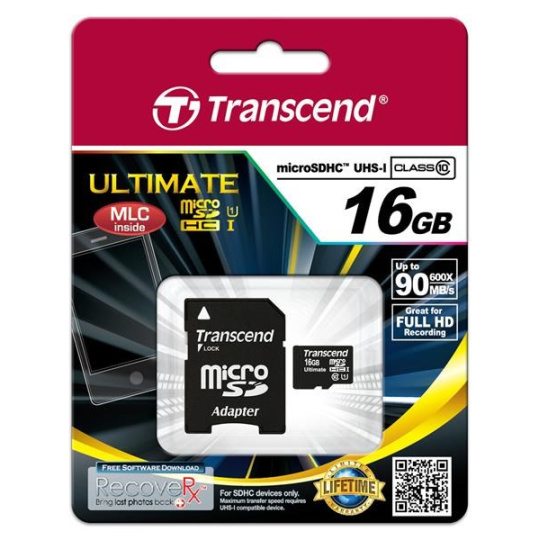 TRANSCEND MicroSDHC karta 16GB Ultimate, Class 10 UHS-I 600x, MLC + adaptér