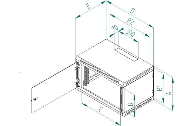 Rozvaděč Delta B je celosvařený nástěnný jednodílný rozvaděč s celoskleněnými dveřmi, které je možné díky masivním pantům otevřít pod úhlem téměř 180°. Důležitou součástí výrobku jsou otvory pro kabely, které jsou umístěny na horní a dolní stěně. Další dva otvory jsou umístěny na zadní stěně rozvaděče. Otvory jsou zaceleny vylamovacími záslepkami, které je možné vylomit s pomocí např. šroubováku. 19“ zařízení se instalují na vertikální lišty, které je možné plynule natavit podle potřeby do hloubky těla rozvaděče. Díky perforaci je zajištěna přirozená cirkulace vzduchu a chlazení komponentů. Přesné rozměry a další technické údaje jsou uvedeny níže (hodnoty R1 a R2 označují rozteče montážních otvorů pro zavěšení rozvaděče na zeď). Maximální zatížení rozvaděče je 30 kg. Rozměry: A – 500 mm B – 395 mm C – 490 mm D – 600 mm E – 395 mm R1 – 454 mm R2 – 420 mm Hmotnost – 17,4 kg Příbal: Klíč - přední dveře 2x Vrut 6x50 4x Podložka 6,6 4x Hmoždinka 10 4x Plastová podložka 8x Plovoucí matice M6 8x Šroub M6x16 8x Protiprachová záslepka 1x.