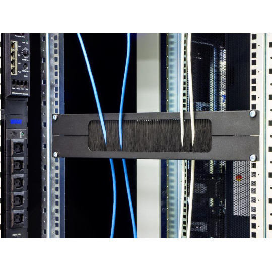 19" průchozí panel 2U rozdělený horizontálně, kartáč, otvor 330 x 55 mm.
