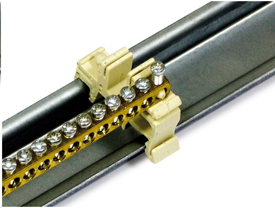 Zemnící modul na liště DIN určený pro montáž na 19“ vertikály, 36 přípojných míst do max. průřezu 10 mm2, jedno přívodní místo do max. průřezu 25 mm2.