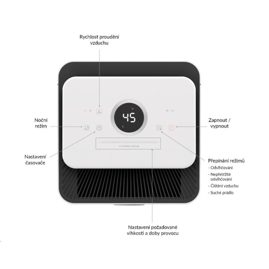 Odvlhčovač je vybaven časovačem, který nastavíte na dotykovém displeji. Potěší vás jistě i noční režim, kdy odvlhčovač pracuje automaticky a tiše, takže vás nijak neruší při spánku. Výhodou je i speciální režim pro sušení prádla, které jinak vlhkost vzduchu výrazně zvyšuje. S tímto režimem vás nadbytečná vlhkost trápit nebude a prádlo vám bude schnout rychleji.