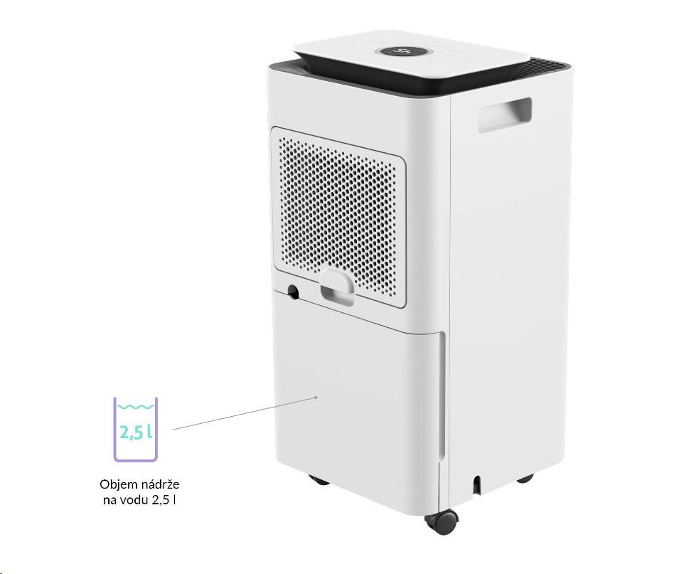 Odvlhčovač a čistička vzduchu, odvlhčovací kapacita 12 l/den, kapacita nádrže na vodu 2,5 l, ničí viry a bakterie, dotykový displej, automatický provoz, dva způsoby odvodu vody, indikátor plné nádrže, senzor vlhkosti vzduchu, časovač, noční režim, režim na sušení prádla. Hmotnost 11 kg, kolečka, bílá barva, čistý design..... více