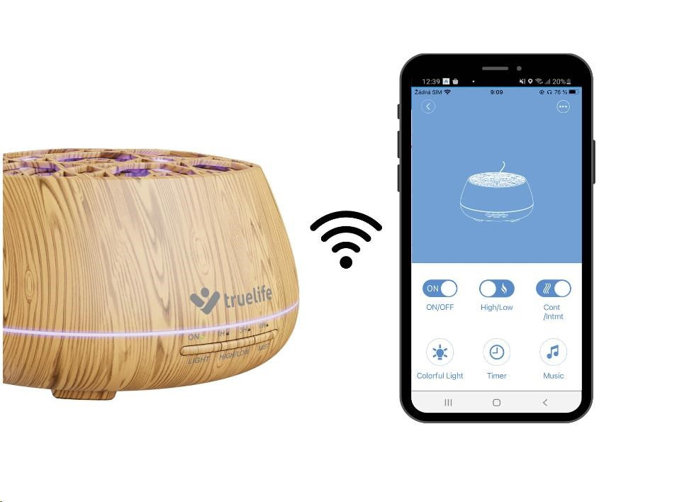 Difuzér lze připojit na WiFi síť a ovládat prostřednictvím aplikace TrueLife Smart.