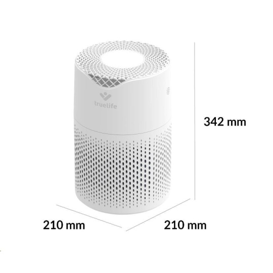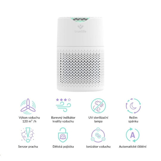 Čistička vzduchu TrueLife vyčistí až 120 m3 vzduchu za hodinu. Je vhodná do místnosti o velikosti 12-18 m2 a díky nízké hmotnosti jí můžete bez obav přenášet. Čistička celkově zlepšuje kvalitu vzduchu, ničí viry, bakterie a další nečistoty a může tak významně pomoci alergikům nebo astmatikům. Čistička je opatřena barevnými indikátory kvality vzduchu, funkcí automatické detekce nečistot a automatického čištění. Bydlíte-li na místě, kde se často práší, potěší vás přítomnost prachového senzoru. 6 násobná filtrace v podobě anti-bakteriálního filtru, HEPA filtru, uhlíkového filtru, katalytického filtru, UV světla a ionizace zachytí až 99,9% polétavého prachu a vyčistí 93,5 % těkavých organických látek. Zároveň zachycuje viry a koronaviry.