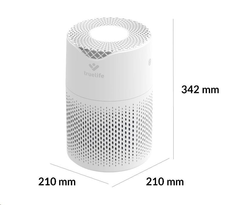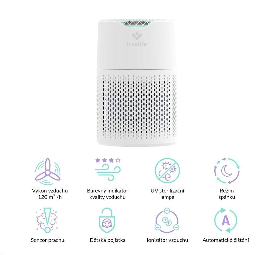 Čistička vzduchu TrueLife vyčistí až 120 m3 vzduchu za hodinu. Je vhodná do místnosti o velikosti 12-18 m2 a díky nízké hmotnosti jí můžete bez obav přenášet. Čistička celkově zlepšuje kvalitu vzduchu, ničí viry, bakterie a další nečistoty a může tak významně pomoci alergikům nebo astmatikům. Čistička je opatřena barevnými indikátory kvality vzduchu, funkcí automatické detekce nečistot a automatického čištění. Bydlíte-li na místě, kde se často práší, potěší vás přítomnost prachového senzoru. 6 násobná filtrace v podobě anti-bakteriálního filtru, HEPA filtru, uhlíkového filtru, katalytického filtru, UV světla a ionizace zachytí až 99,9% polétavého prachu a vyčistí 93,5 % těkavých organických látek. Zároveň zachycuje viry a koronaviry.