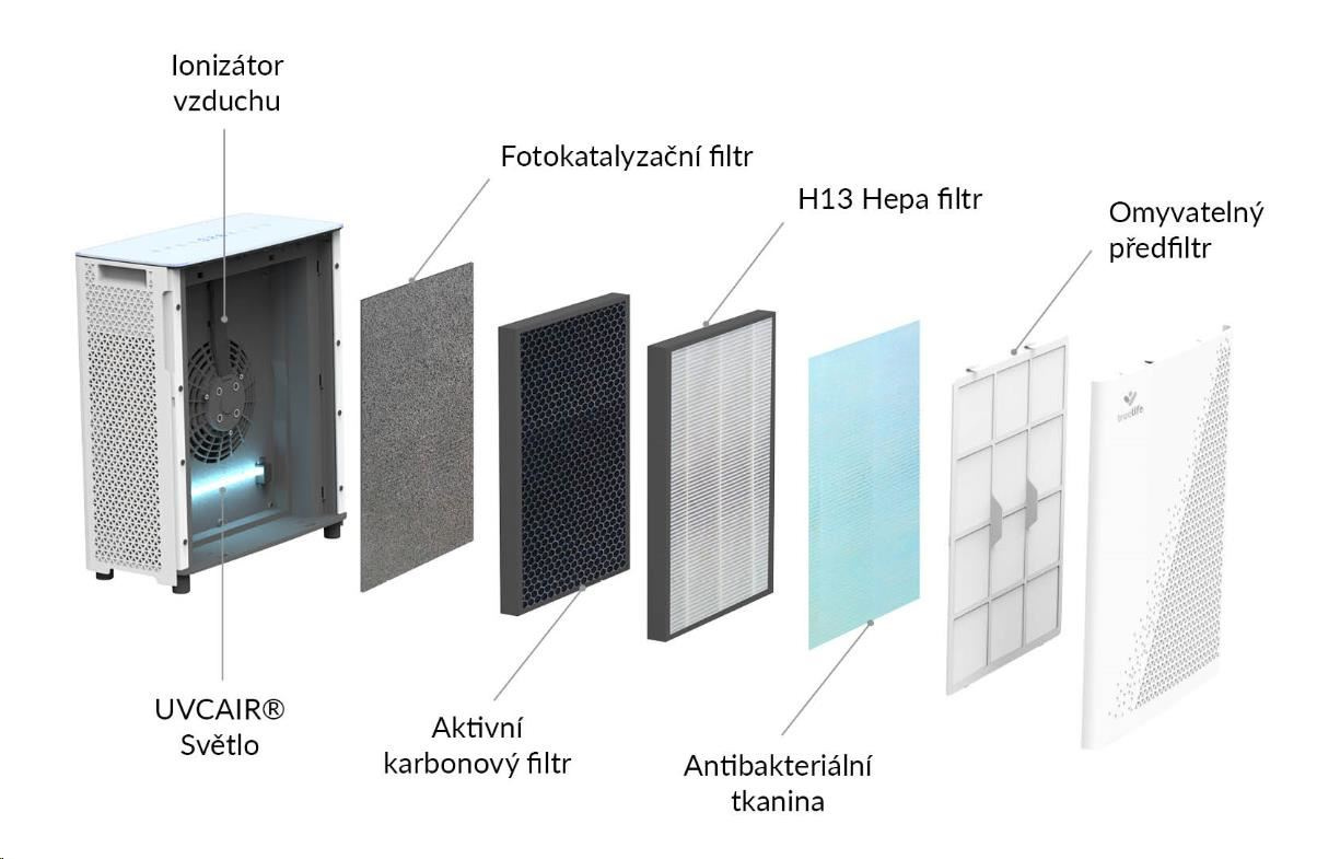 7 násobný filtrační systém odstraňuje ze vzduchu prach, pyl, zvířecí alergeny, bakterie a viry, koronaviry, spory plísní. Nejrozšířenější alergeny jsou tak ze vzduchu odstraněny.