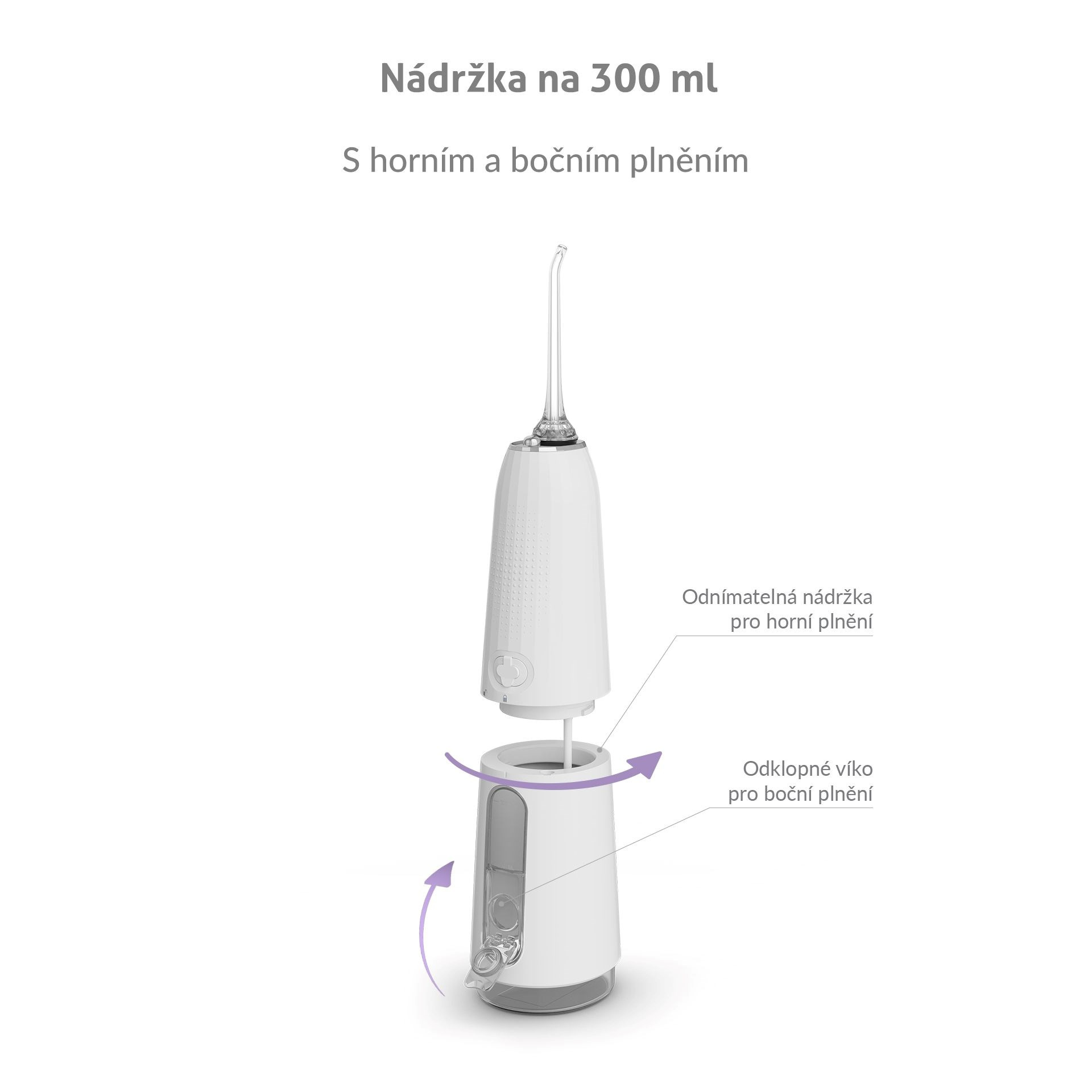 Nádržka o objemu 300 ml vystačí na vyčištění celého chrupu a zároveň je dostatečně kompaktní. Kromě obyčejné vody jí můžete naplnit ústní vodou pro extra svěžest.