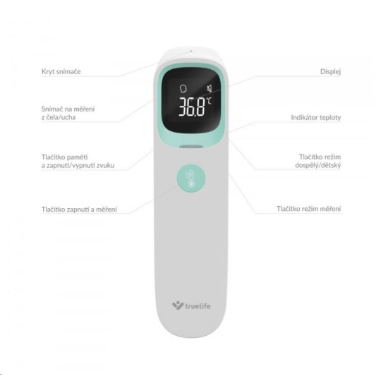 TrueLife Care Q10 BT nabízí tři režimy měření teploty. Kromě klasického měření tělesné teploty dokáže změřit i předměty, povrchy, nebo tekutiny. Snadno tak můžete zkontrolovat třeba kojeneckou stravu nebo čaj. U měření tělesné teploty osob máte možnost volby mezi měřením z teploty z ucha, nebo čela. Teploměr disponuje i dětským režimem, který je uzpůsoben pro osoby mladší 12 let.