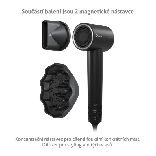 K vybavení fénu patří 2 nástavce, které díky magnetu rychle nainstalujete. Kromě vysoušení s nimi snadno vytvoříte i styling. Koncentrační nástavec využijete pro cílené foukání a fixaci konkrétních míst. Difuzér umí držet vlasy oddělené a vyzdvihnout je u kořínků.