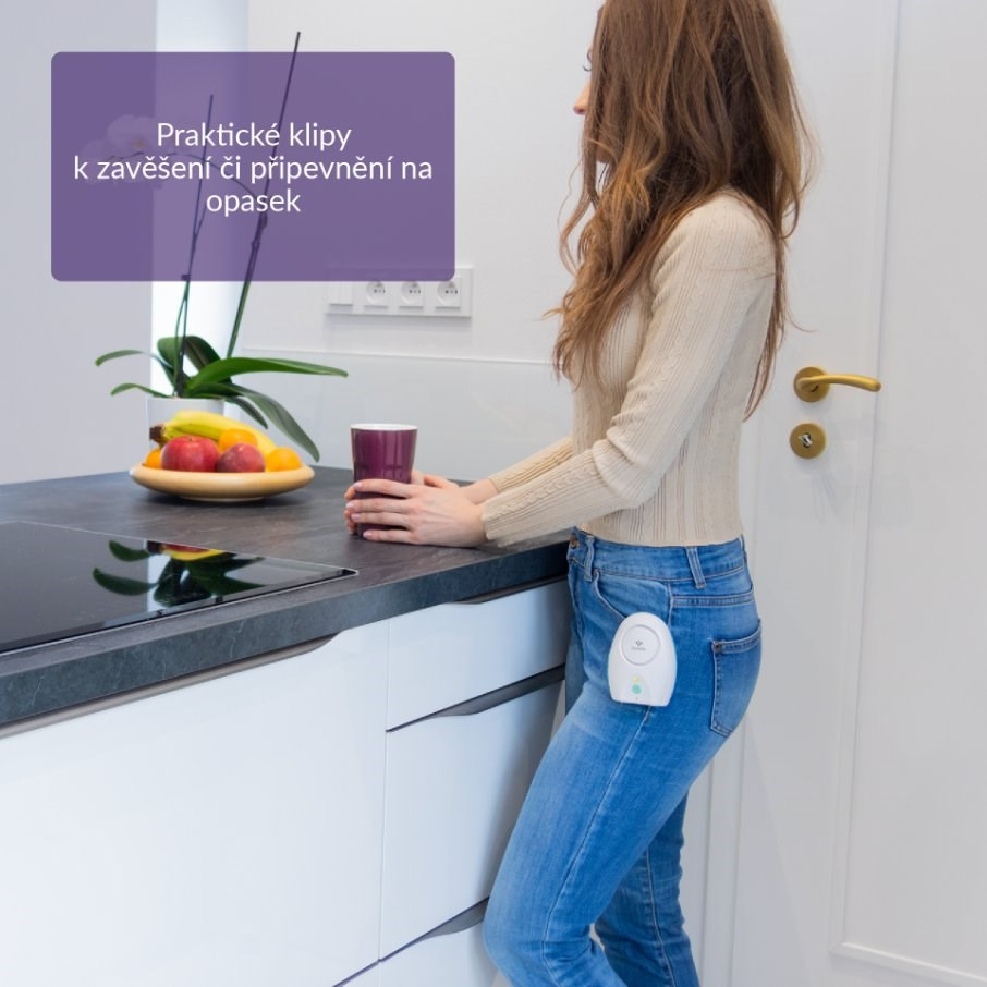 Obě jednotky mají praktický klip, který slouží k zavěšení či připevnění na opasek. S chůvičkou se tak můžete pohodlně pohybovat.