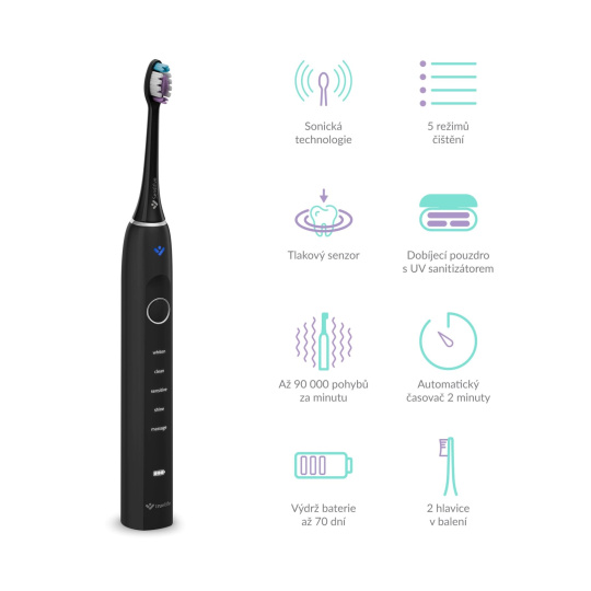 Balení sonického kartáčku zahrnuje 2 hlavice, které jsou určeny pro běžné každodenní čištění (Standard) a pro citlivé zuby (Sensitive). Dokoupit lze hlavici Whiten na bělení zubů.