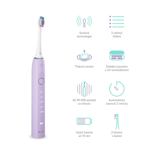 Chytré technologie pro tu nejlepší dentální péči se potkávají v TrueLife SonicBrush Clean70 UV, sonickém kartáčku v elegantní levandulové variantě, který odstraní s výkonem až 90 000 pohybů za minutu až 12× více zubního plaku než manuální kartáček. Sonická technologie SonicTrue® pomocí jemných vibrací čistí plošky zubů a díky víření vody s pastou vytváří mikrobublinky, které proniknou i do mezizubních prostor. Tlakový senzor s technologií SmartPressure® hlídá, abyste si přílišným tlakem na zuby a dásně nepřivodili zdravotní obtíže. Velkou službu vám prokáže také UV sterilizace ukrytá v dobíjecím pouzdře, která efektivně ničí až 99,9 % bakterií a virů z hlavice kartáčku. Hýčkat své zuby můžete doma i na cestách, a to až 70 dní na jedno nabití, pomocí 5 režimů čištění (Whiten, Clean, Sensitive, Shine, Massage) a 2 přiložených hlavic (Standard a Sensitive). Poslední použitý režim zůstává uchován v paměti a automaticky se spustí po opětovném zapnutí. Kartáček běží ideální 2 minuty, na něž je nastavený časovač. Díky vysoce citlivému vibračnímu senzoru se navíc automaticky aktivuje a rozsvítí, jakmile jej vezmete do ruky, stačí uchopit a můžete začít čistit. Speciální jemně pogumovaná povrchová úprava rukojeti je příjemná na dotek a zabraňuje klouzání i při použití s vodou.