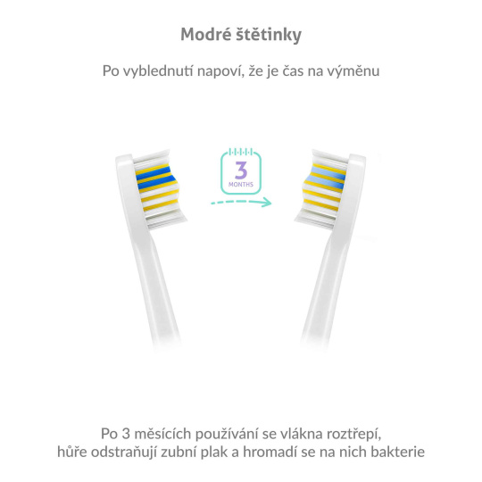 Hlavice disponují modrými štětinkami, které indikují míru opotřebení. Snadno poznáte, že je načase hlavici vyměnit.