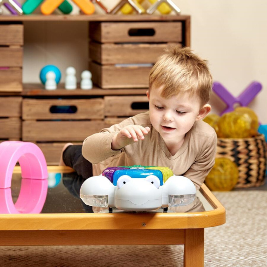 Multisenzorová interakce: Glow and Go Bot obsahuje barevná tlačítka, která se rozsvěcují a vydávají zvuky při stisknutí, což podporuje interakci a učení dětí.