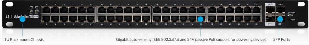 Novou řadu produktů EdgeMAX tvoří gigabitové management PoE+ switche. Vyznačují se vysokým výkonen (26/70Gbps non-blocking throughput) spolu s pokročilými L2/L3 funkcemi. K dispozici je inteligentní PoE. Ve výchozím stavu je aktivní PoE dle 802.3af/at, v případně nutnosti pasivního PoE (24V) lze manuálně nakonfigurovat (ON/OFF 24V na každý port). K dispozici jsou taktéž SFP sloty pro připojení k páteřní síti. 24 portová verze nabízí dva porty 1Gbps SFP a 48portová verze k tomu přidává navíc dva SFP+ sloty (10Gbps). Konfiguraci lze provádět standartně přes webový prohlížeč, prostředí je velmi uživatesky přívětivé a intuitivní. Pro pokročilé uživatele je taktéž k dispozici CLI (command-line-interface) skrz telnet či zabezpečené SSH.