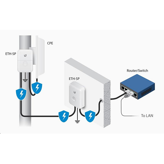 Přestože všechny UBNT jednotky disponují integrovanou ESD ochranou, lze ETH-SP použít jako další vrstvu ochrany, vřele doporučujeme. Šance na poškození vlivem ESD se tím výrazně eliminuje.