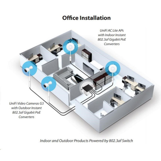 Pomocí tohoto gigabitového konvertoru je možné napájet jednotky UBNT switchem s aktivním PoE dle 802.3af (48V). Konvertor komunikuje se switchem dle 802.3af a do výstupu propouští již klasické pasivní PoE, v tomto případě 24V/0,5A. Lze použít se všemi jednotky od Ubiquity (je kompatibilní i s routerboardy od Mikrotiku).