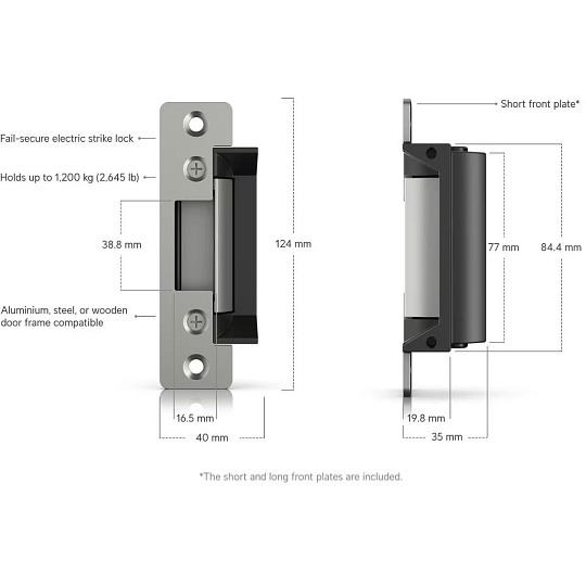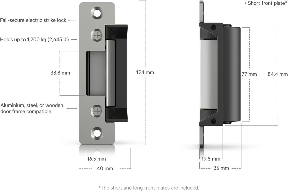 Popis produktu Bezpečnostní elektrický zámek určen k propojení s UniFi Access Hub. Zámek je typu fail-secure, při selhání zůstane uzamčen. Může být nainstalován do dřevěných, ocelových i hliníkových rámů. Zámek odolá síle až 1200kg. Napájení je přes dvoužilovou svorkovnici 12V DC / 400mA. Kompatibilita • UA-Hub-Door • EAH-8 • UA-Hub-Door-Mini • UA-Ultra • UA-Hub-Gate Technické parametry Napájení Typ napájení:DC svorkovnice Napájení přes konektor/svorkovnici:12V DC Fyzické charakteristiky Nosnost [kg]:1200 Materiál:Nerezová ocel, Zinek Provozní teplota [°C]:-10 až 45 Hmotnost [g]:185 Šířka [mm]:40 Výška [mm]:80 Hloubka [mm]:35.