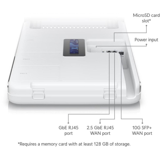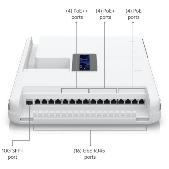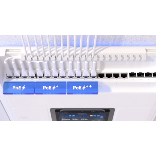 Popis produktu Dream Wall je další z řady zařízení UniFi All-in-one. Ukrývá v sobě bránu s firewallem, Wi-Fi 6 access point, NVR a switch s funkcí PoE. Jednotka poskytuje široké možnosti připojení do sítě. Nabízí možnost připojení 10Gbps SFP+ portem nebo ethernetovým portem 2.5Gbps. Pro připojení dalších zařízení v síti LAN pak nabízí 10Gbps SFP+ port spolu se 17 ethernetovými 1Gbps porty, z nichž 12 disponuje funkcí PoE (4x POE++, 4x POE+ a 4x POE). Z výroby je zařízení osazeno jedním hot-swap zdrojem s výkonem 550W a k dispozici je druhá pozice pro redundanci. Maximální spotřeba zařízení činí 532W včetně připojených napájených zařízení. Radiová část podporuje nejnovější standard WiFi 6 (802.11ax), je zpětně kompatibilní se staršími standardy a disponuje technologií MIMO 2x2 (2.4 Ghz) a 4x4 (5 GHz) s maximální modulační rychlostí 300 + 2400 Mbps. Ke všem důležitým informacím o zařízení a síti se dostanete ihned díky integrovanému displeji s úhlopříčkou 4,7". Pro ukládání kamerových záznamů slouží předinstalovaná 512GB microSD karta a zařízení disponuje také vlastním SSD diskem s kapacitou 128GB. Podporované UniFi služby • UniFi Network Controller • UniFi Protect • UniFi Access • UniFi Talk • UniFi Connect Výhody UniFi řešení • Zero Handoff Roaming - bezvýpadkový přechod mezi jednotlivými AP • Wireless uplink (hodí se tam, kam není možné dostat datový kabel) • Až 4 SSID • Detailní statistiky provozu • Guest síť • Load balance - udržování rovnoměné zátěže / přepínání klientů • Omezování rychlosti pro každé SSID Technické parametry Bezdrátové vlastnosti Bezdrátové frekvence:2.4 + 5 GHz (dual band) WiFi standardy:802.11n, 802.11a, 802.11ac, 802.11b/g, 802.11ax Přenosová rychlost - 5GHz [Mb/s]:2402 Přenosová rychlost - 2.4GHz [Mb/s]:300 Vysílací výkon 2.4GHz [dBm]:23 Vysílací výkon 5GHz [dBm]:26 Šifrování:WEP, WPA, WPA2, WPA3 2.4GHz MIMO:2 x 2 5GHz MIMO:4 x 4 Typ antény:Vestavěná Roaming:Ano Zisk antény [dBi]:6 Konektory a rozhraní Rychlosti WAN:(1) 100/1000/2500Mbps Slot na paměťové karty:microSD - až 512GB Rychlost LAN:(17) 10/100/1000Mbps Gigabit LAN:Ano Optické rozhraní:(2) 10Gbps Ostatní:Dotykový displej, Bluetooth Napájení Typ napájení:Ze sítě (230V) Typy PoE:PoE-Out (pouze) Podporované PoE-Out standardy:802.3af, 802.3at, 802.3at - ultra PoE (60W) Redundantní napájení:Ano Počet PoE Out portů:12 PoE budget [W]:422 Max. spotřeba energie [W]:532 Napájení přes konektor/svorkovnici:230V AC Fyzické charakteristiky Provedení:Na zeď Použití:Vnitřní Tlačítka:Reset Provozní teplota [°C]:-10 až 40 Hmotnost [g]:8600 Šířka [mm]:342 Výška [mm]:549 Hloubka [mm]:62 Hardware CPU:ARM Cortex-A57 Frekvence CPU [MHz]:1700 Počet CPU jader:4 RAM [MB]:4096 Software Předinstalovaný kontroller:UniFi Protect, UniFi controller Operační mód:AP Router Management:UniFi controller Výchozí IP adresa:192.168.1.1 Výchozí jméno a heslo:Nastavuje se při prvním spuštění.