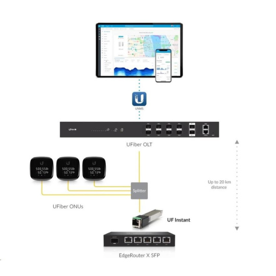 UF-Instant je GPON SFP modul s jedním SC konektorem a je určený do Ubiquiti jednotek řady EdgeSwitch, EdgeRouter, UniFi Switch a USG nebo s produkty UF-AE a F-POE-G2. Modul je určený pro trasy dlouhé až 20km a je schopen komunikovat s OLT jednotkou asymetrickou rychlostí 2.4Gbps download a 1.2Gbps upload.