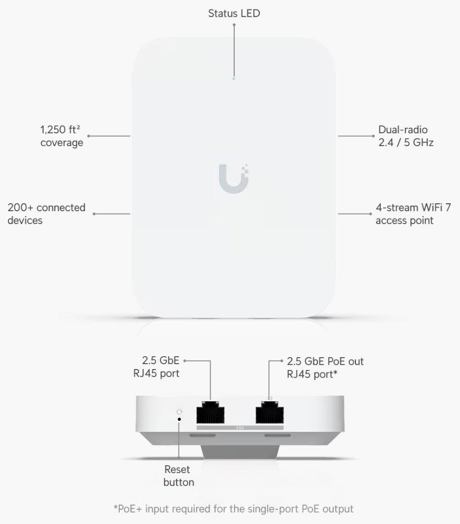 Popis produktu U7-IW je WiFi 7 access point z rodiny UniFi, který je určený k zabudování na krabičku ve zdi. Dual-band WiFi 7 nabízí maximální modulační rychlost až 4,3Gbps v pásmu 5 GHz a až 688Mbps v pásmu 2.4 GHz. Pro připojení k síti má na zadní straně (1) 2.5G ETH port, který slouží i pro napájení jednotky pomocí PoE 802.3af/at či pasivního PoE 42,5 až 57V DC. I po instalaci na krabičku vám zůstanou dostupé (2) 2.5G ETH porty, z nichž jeden podporuje PoE-OUT pro připojení dalšího zařízení. V případě využití PoE-OUT funkce je potřebné jednotku napájet PoE+ 802.3at 30W. Centrální řízení jednotek K zařízení je potřeba stáhnout z oficiálních stránek originální software nazývaný UniFi Network, díky kterému lze řídit celou síť. Nespornou výhodou UniFi Network je, že je zcela zdarma bez jakéhokoliv omezení! Tento centrální management umožní nahrávat mapy a nastavit základní parametry jako například SSID, guest účet, úvodní stránku, statistiky provozu i seznam a status asociovaných klientů vždy snadno a rychle. Výhody UniFi řešení • Roaming - přechod mezi jednotlivými AP bez výpadků • Wireless uplink – ideální pro místa, kam nelze přivést datový kabel • Až 8 SSID • Detailní statistiky provozu • Guest síť • Voucher system • Load balancing - udržování rovnoměné zátěže / přepínání klientů • Omezování rychlosti pro každé SSID Obsah balení • Zařízení • Podložka na přichycení ke zdi • Šroubky Technické parametry Bezdrátové vlastnosti Bezdrátové frekvence:2.4 + 5 GHz (dual band) WiFi standardy:802.11n, 802.11a, 802.11ac, 802.11b/g, 802.11ax, 802.11be MU-MIMO:Ano Přenosová rychlost - 5GHz [Mb/s]:4300 Přenosová rychlost - 2.4GHz [Mb/s]:688 Vysílací výkon 2.4GHz [dBm]:23 Vysílací výkon 5GHz [dBm]:24 Šifrování:WPA, WPA2, WPA3 2.4GHz MIMO:2 x 2 5GHz MIMO:2 x 2 Typ antény:Vestavěná Roaming:Ano Zisk antény [dBi]:4, 8 Konektory a rozhraní Rychlost LAN:(3) 100/1000/2500Mbps Gigabit LAN:Ano Napájení Napájení přes PoE:802.3af, 802.3at, 42 .. 57V DC Typy PoE:PoE-Out + PoE-In Počet PoE Out portů:1 Max. spotřeba energie [W]:13 Fyzické charakteristiky Použití:Vnitřní Tlačítka:Reset Provozní teplota [°C]:-30 až 40 Hmotnost [g]:400 Šířka [mm]:99 Výška [mm]:137 Hloubka [mm]:30 Software Operační mód:Access Point.