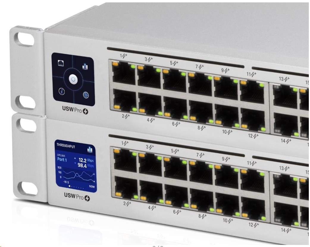 Na dotykovém displeji okamžitě vidíte nejdůležitejší informace jako chybové stavy, varování, statistiky portů, spotřebu připojených zařízení, vytížení sítě a další.