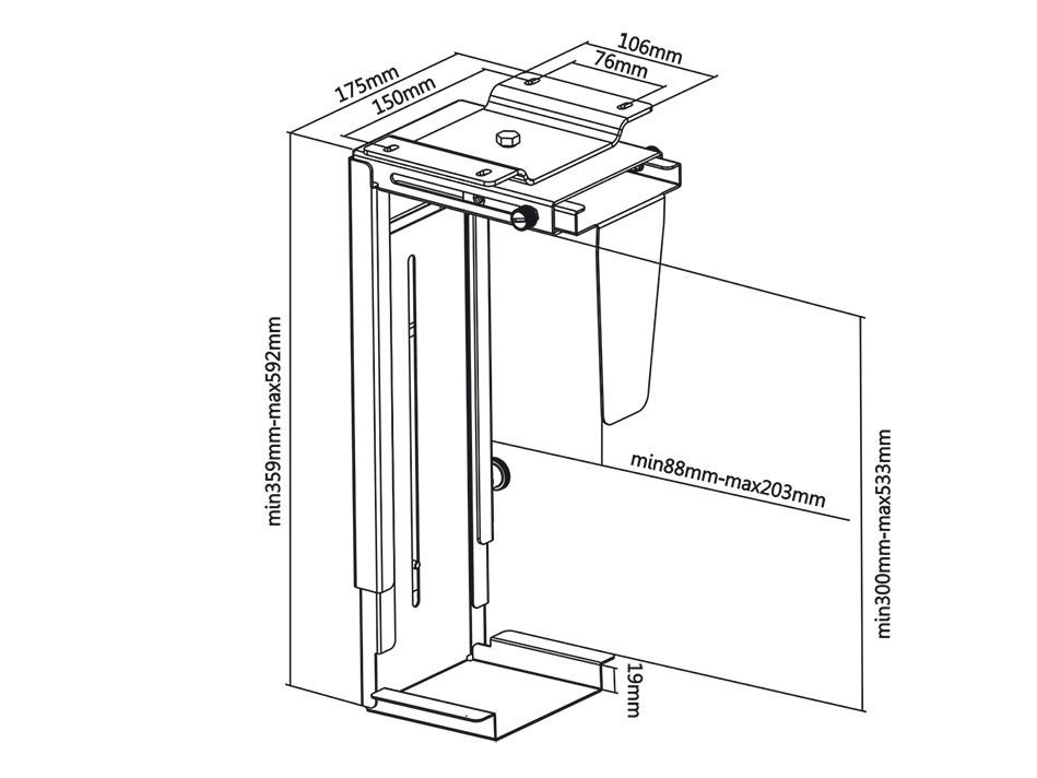 Univerzální držák na PC Fiber Mounts M7C13S Profesionální držák na PC, uchycení na stůl nebo stěnu, nastavení na požadované rozměry, nosnost 10kg Držák na PC špičkové kvality a bezpečnosti. Velmi pevné uchycení vašeho PC na stůl nebo stěnu. Nastavení na rozměry vašeho PC. Materiál ocel, barevné provedení stříbrné. Na PC s hmotností až 10kg. Snadná a rychlá instalace. Záruka 5 let. Držák na PC / počítač pro uchycení pod stůl, na bok stolu nebo na stěnu, případně na strop Fiber Mounts M7C13S Technické údaje: nosnost 10kg univerzální, vhodný na většinu dostupných PC šířka PC od 88mm do 203mm výška PC od 359mm do 592mm délka PC není podstatná otáčení do stran zajištění v požadovaných rozměrech profesionální výrobek špičkové kvality bezpečný, pevný, spolehlivý uchycení na svislou nebo vodorovnou plochu pod stolovou desku, na bočnici stolu, na stěnu nebo i na strop materiál ocel barevné provedení stříbrné záruka 5 let Stolní držák na počítač PC Fiber Mounts M7C13S Univerzální držák PC, který uchytíte na jakoukoliv svislou nebo vodorovnou plochu - pod desku stolu, na bočnici stolu, na stěnu nebo třeba na strop. Univerzální, nastavení na potřebné rozměry a zajištění v pozici. Snadná a rychlá montáž..