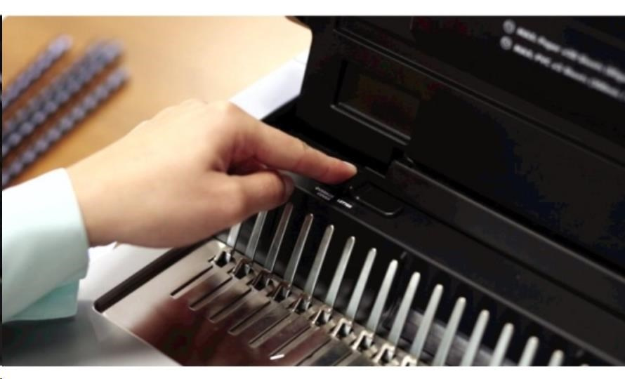 Stroj je vybaven větším zásobníkem na uložení několika plastových hřbetů a integrovanou měrkou pro správnou volbu průměru hřbetu.