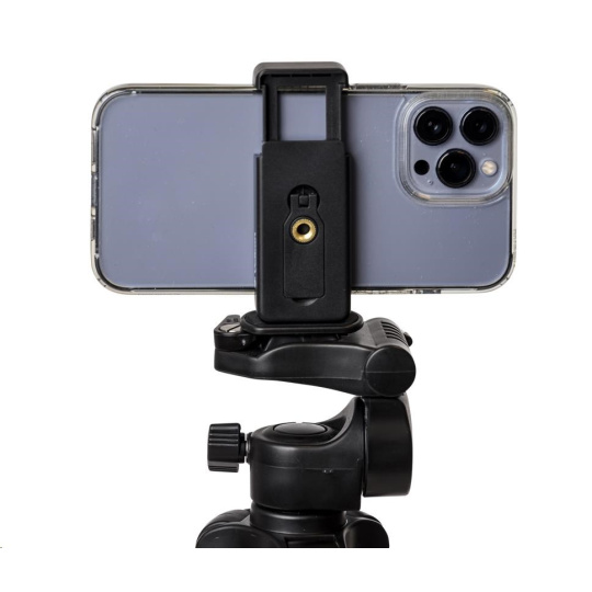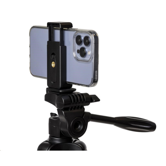 A lightweight aluminium tripod with a three way pan/tilt head and smartphone holder. It can reach a maximum height of 123cm, and can hold up to 2kg. This tripod is perfect for you who use a smaller camera or smartphone