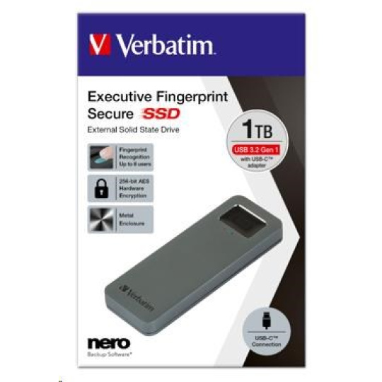 VERBATIM externí SSD 512GB, Executive Fingerprint Secure SSD, USB 3.2 Gen 1/USB-C, (W:356 MB/s, R:344 MB/s), šedá