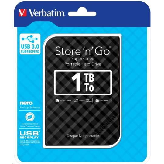 VERBATIM HDD 2.5" 1TB Store 'n' Go Portable Hard Drive USB 3.0, Black Special Features: Colours available: Black, Silver, White, Red & Blue Capacities available: 500GB, 1TB & 2TB High speed, high capacity storage. A fast & safe solution to expand storage or backup files USB 3.0 SuperSpeed - for ultra fast data transfer Nero Backup Software Energy Saving Software USB REC & PLAY* - supports USB recording/ playback 2 year limited warranty** System requirements: PC or Mac with USB 3.0 Windows XP / Vista / Windows 7 & 8 Mac OS X 10.4 or higher Pack Contents: Portable Hard Drive / USB 3.0 Cable / Nero Backup Software / Green Button Energy Saving Software / Verbatim Formatter / Quick Start Guide / User Guide (pre-loaded on the drive).