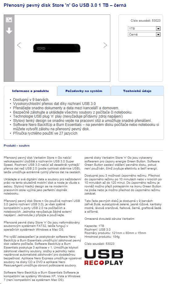 Verbatim Store 'n' Go Portable Hard Drive 1TB USB 3.0 Special Features: Colours available: Black, Silver, Eucalyptus Green, Hot Pink, Caribbean Blue, Violet, Volcanic Orange, Sunkissed Yellow, Graphite Grey Ultra fast USB 3.0 2.5@ (6.35cm) external hard drive, downwards compatible with USB 2.0 USB 3.0 theoretical maximum data transfer speed: 5Gbps -> up to 10x faster than USB 2.0 FAT-32 pre-formatted, immediately ready to be used on both PC and Mac Including extensive software package: Backup software for easy file backup from computer to external hard drive, Green Button energy saving software, controls the power consumption of your drive, Formatting software for easy (re)formatting of your external hard drive 2 years manufacturer’s warranty Product Weight: 184 grams Product Dimensions: 80mm x 121mm x 15mm (W x L x H) System requirements: PC or Mac with USB 3.0 / USB 2.0 / USB 1.1 Port Windows XP / Vista / Windows 7 Mac OS X 10.4 or higher Linux Kernel 2.6 or higher.