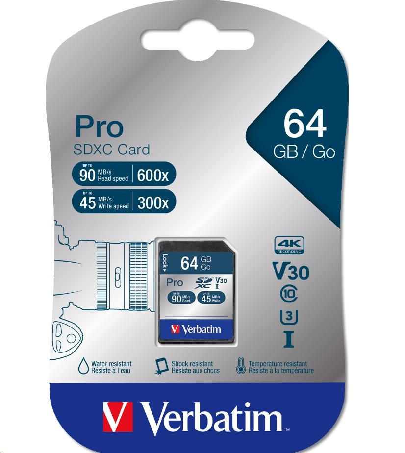 VERBATIM SDXC karta 64GB Pro, U3, V30 (R:90/W:45 MB/s)
