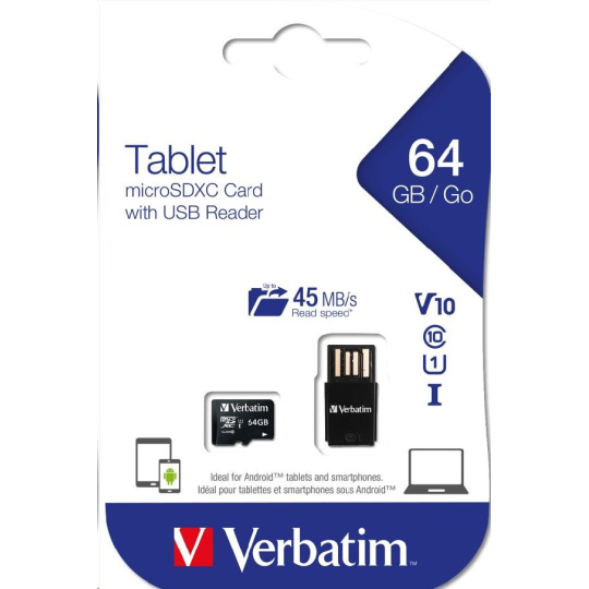 VERBATIM Tablet microSDHC C10/U1 with USB reader 64GB (R:70MB/s, W:10MB/s)