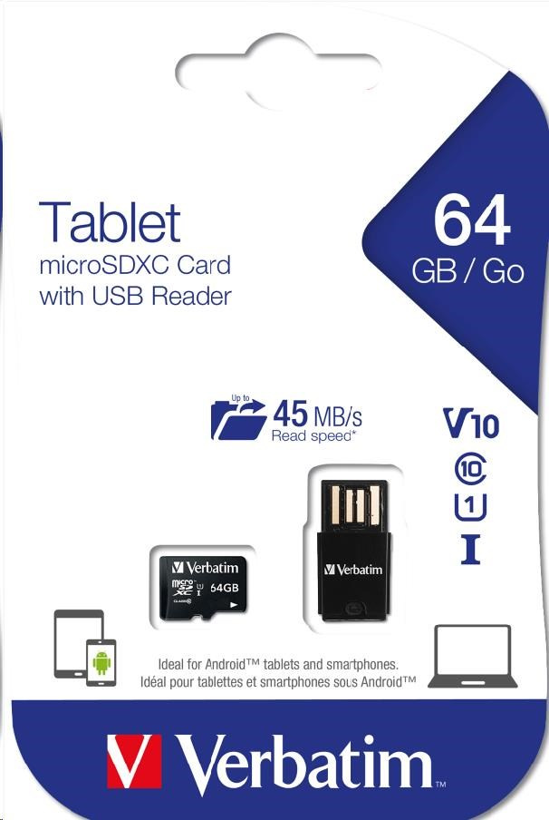 VERBATIM Tablet microSDHC C10/U1 with USB reader 64GB (R:70MB/s, W:10MB/s)