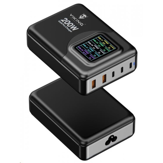 Se třemi výstupy USB-C PD (100W max.) a dvěma USB-A QC (18W max.) je tato nabíječka připravena dodat energii pěti zařízením současně, a to s maximálním výkonem až 200W. S Viking USB GaN charger 200W PD Pro si můžete být jisti, že vaše elektronická zařízení budou nabitá a připravená na akci v rekordním čase. Inteligentní technologie adaptéru Viking Gan 200W PD Pro zvládne rozložit nabíjecí výkon podle počtu využitých výstupů, tak aby nabíjení bylo snadné a efektivní pro všechna připojená zařízení. Rozložení energie a proces nabíjení lze sledovat na přehledném barevném displeji.