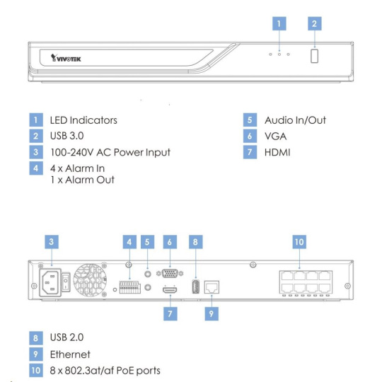 NVR umožňuje vstup z až 8 kanálů (kamery, videoservery). Podporováno je rozlišení 8 MPx neboli 4K UHD při maximální šířce pásma 64 Mb/s. Pro výstup, který lze realizovat až ve 4K, můžete použít rozhraní HDMI, k dispozici je také VGA výstup (max. FullHD). Jednou z hlavních předností tohoto modelu je možnost napájení až 8 kamer přes Ethernet. K dispozici je osm portů s funkcí PoE (celkem max. 120 W), které odpovídají standardům 802.3af a 802.3at. Pomocí správy PoE přes webové rozhraní má uživatel přehled o odběru jednotlivých kamer a může je restartovat.