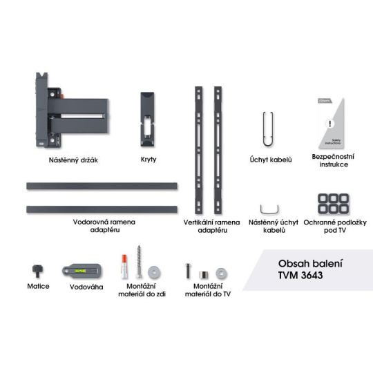 Pro bezpečné naklonění televizoru je nástěnný držák vybaven systémem TiltAnchor™, kterým můžete uzamknout naklánění TV. Měkké podložky na nástěnném držáku chrání zadní stranu televizoru před poškrábáním během jeho montáže. TVM 3643 se snadno instaluje. Součástí balení je vrtací šablona, šrouby, hmoždinky Fischer® DuoPower, stahovací pásky na kabely a vodováha. Jednoduše si vyznačte první vrtací otvor pomocí naší bezplatné aplikace DrillRight™ AR. Je váš televizor mírně nakřivo? Žádný problém. Můžete jej snadno vyrovnat, a to i po instalaci.
