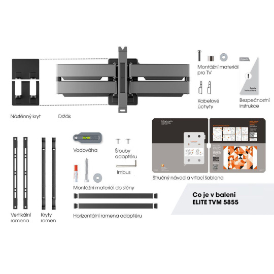 - DrillRight™ AR aplikace a vrtací šablona v balení pro maximální usnadnění montáže, pomocí mobilního zařízení zobrazíte polohu vaší TV na stěně a můžete označit první vrtací otvor pro montáž držáku