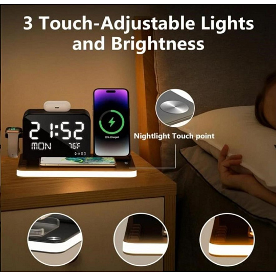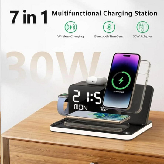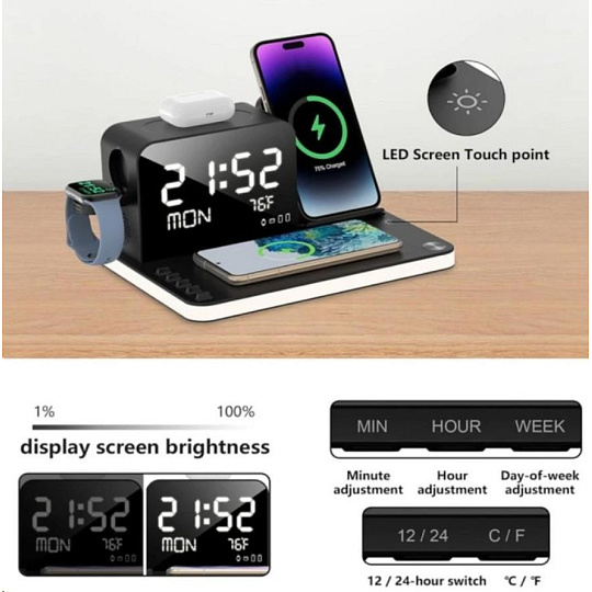 WG Multifunkční zařízení 7v1 (hodiny, datum, teplota, nabíječka telefon+hodinky+sluchátka)