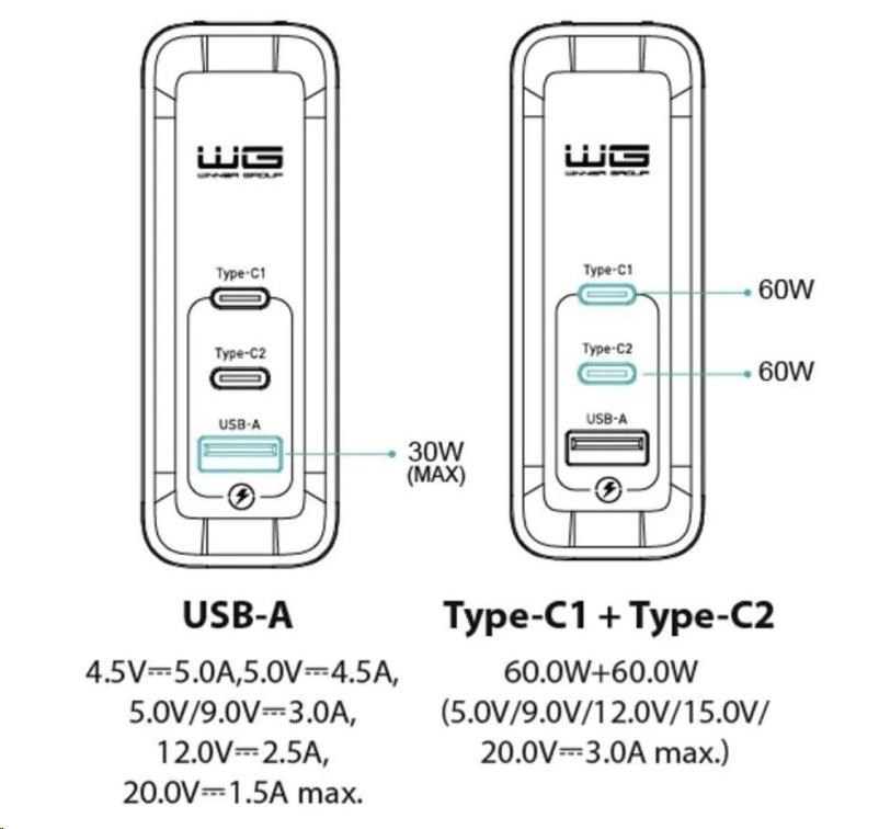 WG - Síťová nabíječka GaN 3x USB 120W, 1x USB-A + 2x USB-C, bílá