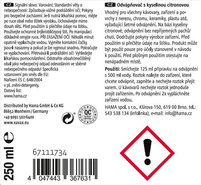 - přípravek pro rychlé odvápnění - vhodný pro všechny zařízení na přípravu čaje, kávy, pressa, kapslové kávovary, i plně automatické kávovary, vařiče vajíček, rychlovarné konvice, ponorné vařiče, hrnce, nerezové hrnce a pánve, dřezy, povrchy z nerezové oceli, chromu, keramiky a plastu atd., které vyžadují šetrné odvápnění - na bázi kyseliny citronové: odvápnění bez nepříjemných pachů/chutí - bezpečnostní uzávěr proti náhodnému otevření dětmi - objem: 250 ml - vyrobeno v Německu Upozornění: Dodržujte pokyny výrobce zařízení. Před použitím si přečtěte údaje na štítku. Před plošným použitím otestujte na nenápadném místě. Použití: Smíchejte 125 ml přípravku na odvápnění s 500 ml vody. Roztok nalejte do zařízení, které chcete odvápnit, zapněte a nechejte roztok přejít varem. U kávovarů nechejte roztok jednoduše projít zařízením. Po odvápnění 2x vypláchněte zařízení vodou..