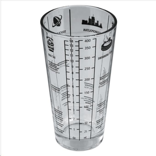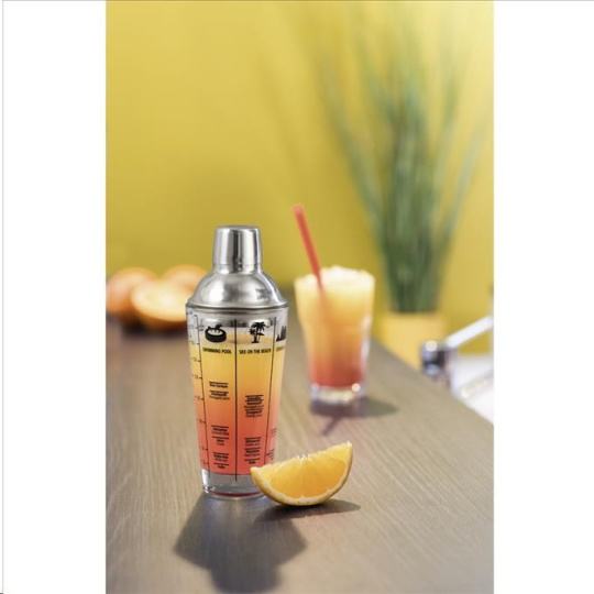 - jednoduchá příprava míchaných nápojů - skleněná lahev, násadka z nerezové oceli s integrovaným sítkem a uzávěrem - uzávěr s objemem 4 cl je ideální pro přesné měření jednotlivých přísad - silikonové těsnění - vybrané oblíbené recepty vytištěné přímo na skleněné lahvi - stupnice na lahvi pro snadnou přípravu nápojů - drink můžete pít přímo ze skleněné lahve - objem: 400 ml - průměr spodní/vrchní: 5,5 cm/8,5 cm - materiál: sklo/nerezová ocel - barva: průhledná/stříbrná Informace pro uživatele: Pouze skleněná lahev šejkru je vhodná do myčky na nádobí. Ostatní části šejkru doporučujeme umývat ručně, abyste zajistili jejich dlouhou životnost..