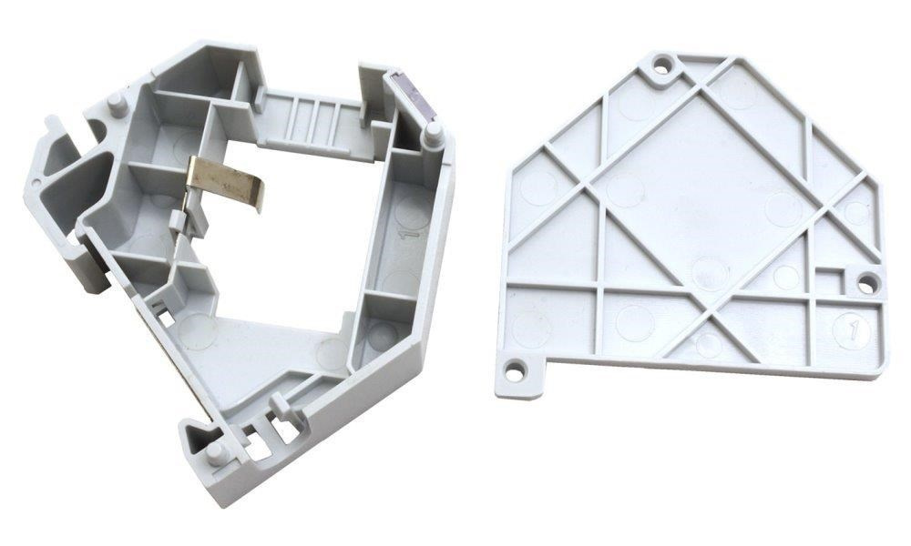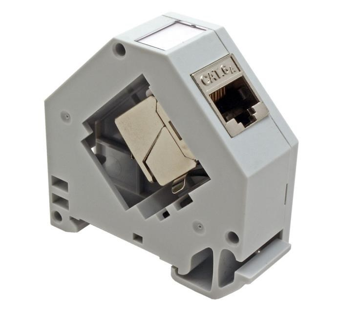 Plastový držák pro 1 keystone na DIN lištu. Integrovaný kovový pásek zajišťuje uzemnění keystone modulu. Štítek pro popis (vyjímá se po sejmutí bočního krytu)..