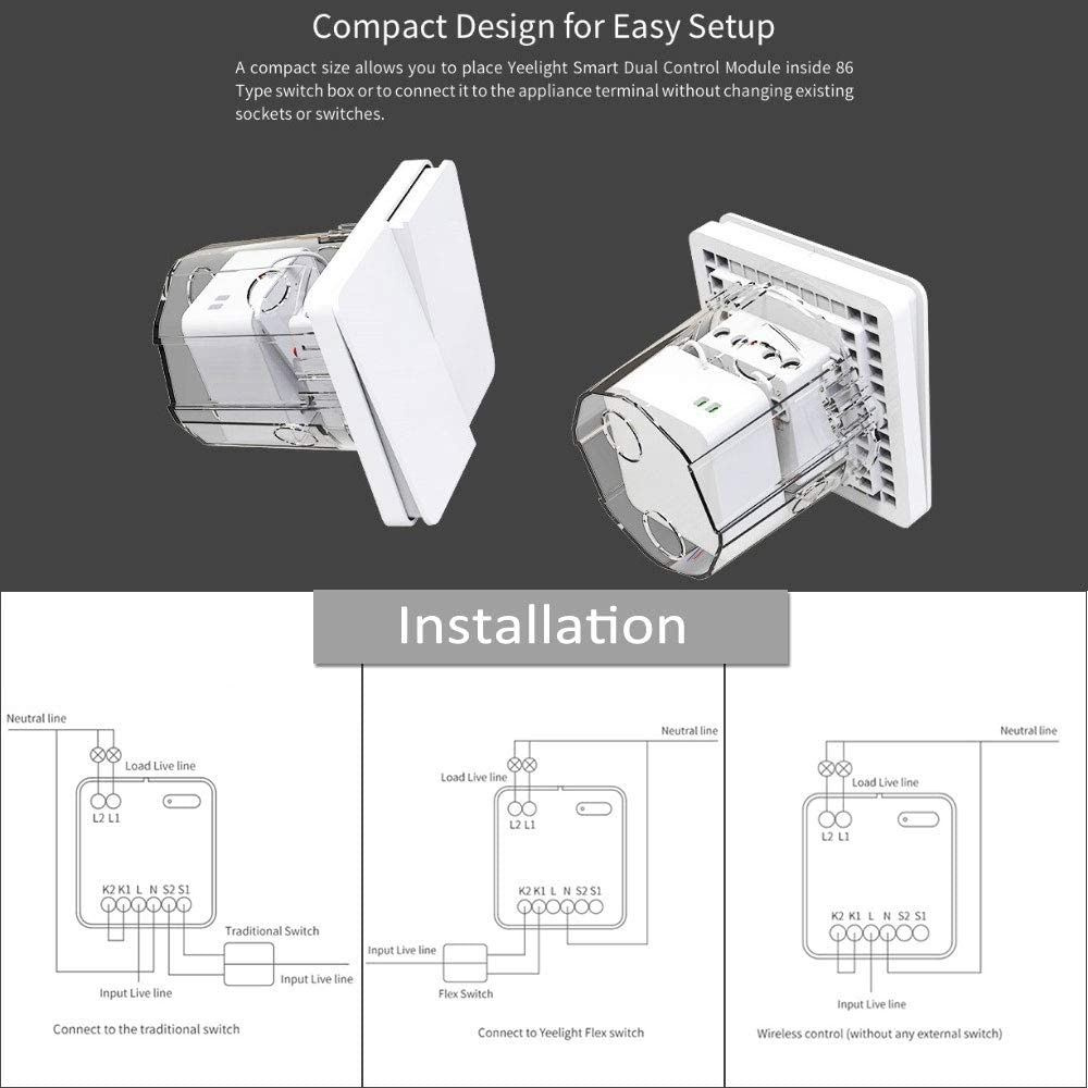 Kompaktní velikost umožňuje, aby byl inteligentní duální ovládací modul umístěn uvnitř spínací skříňky nebo připojen k místu instalace ovládacího panelu nebo stropního svítidla, aniž by se měnily stávající zásuvky a konektory. Díky tomu je konfigurace reléového modulu Yeelight extrémně jednoduchá.