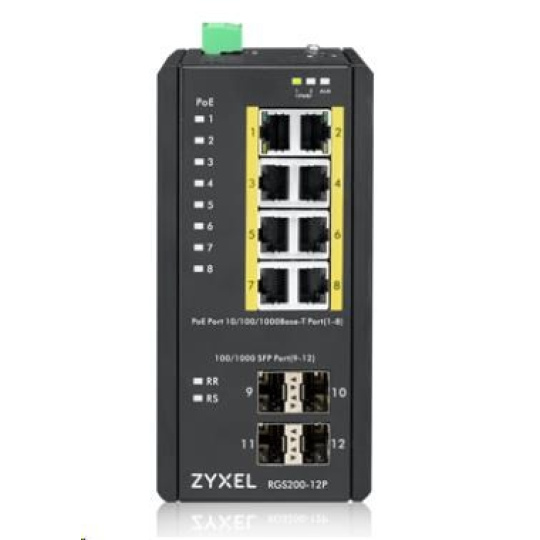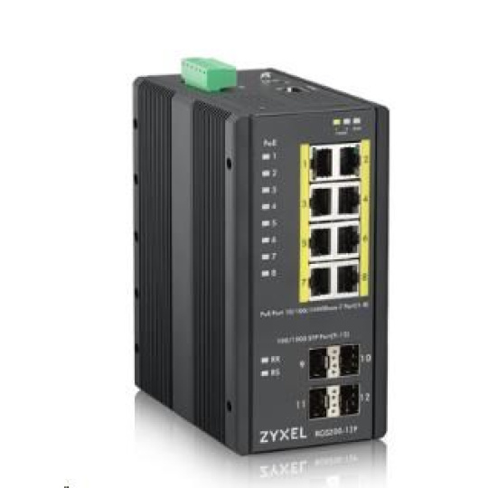 Zyxel RGS200-12P 12-port Gigabit WebManaged PoE switch, 8x GbE + 4x SFP, PoE budget 240W, DIN rail/Wall mount, IP30